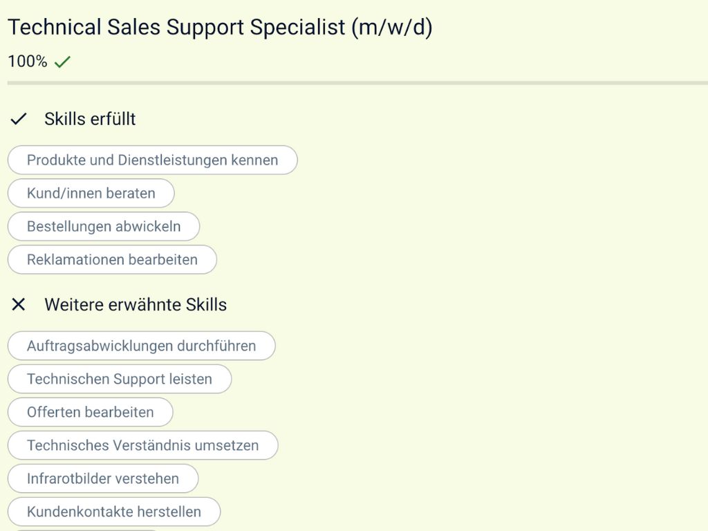 - Du wählst «Technical Sales Support Specialist» aus und siehst sofort, welche Skills dir noch fehlen (s. Bild).
